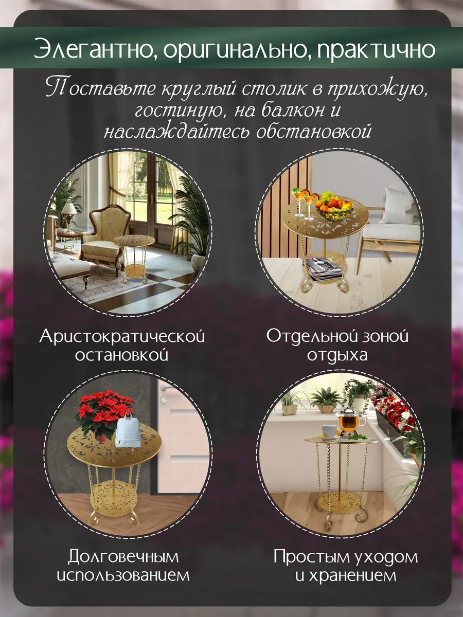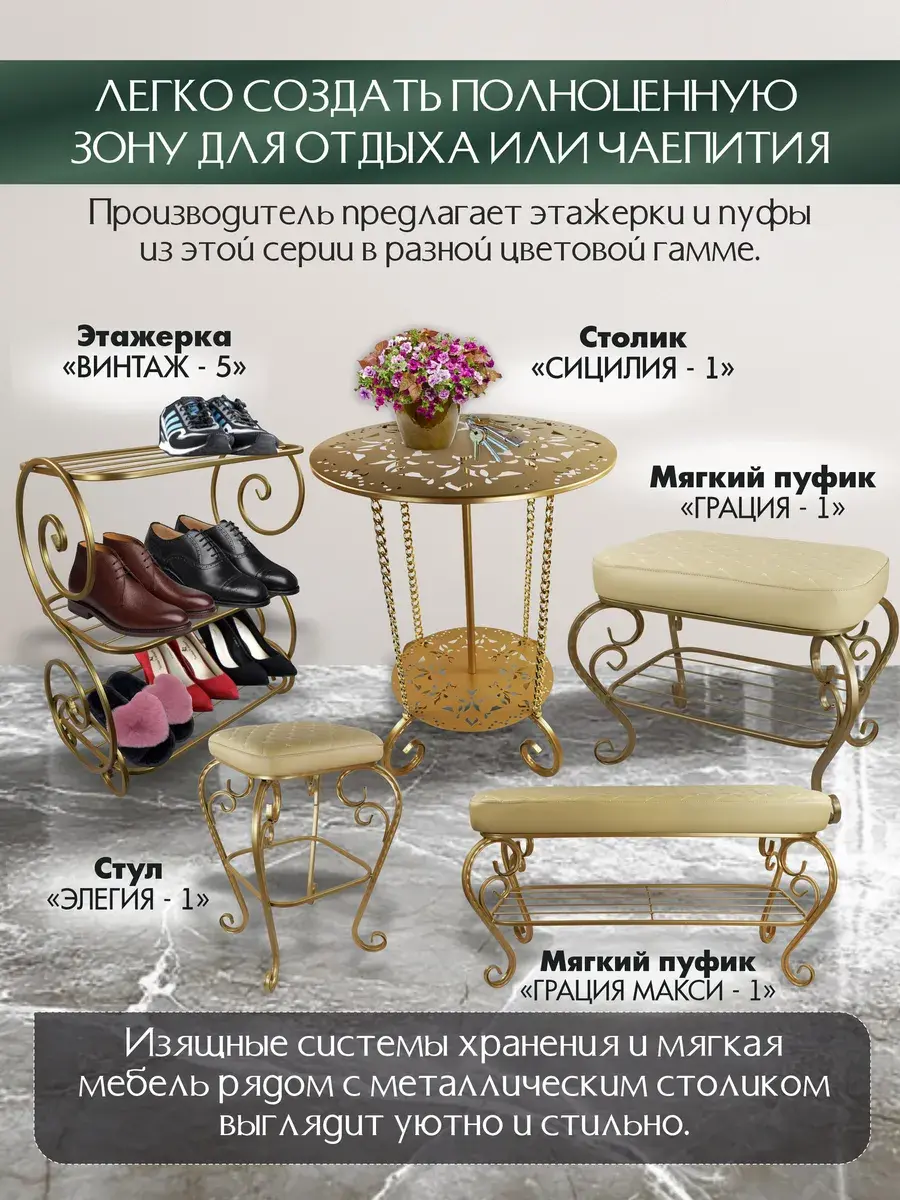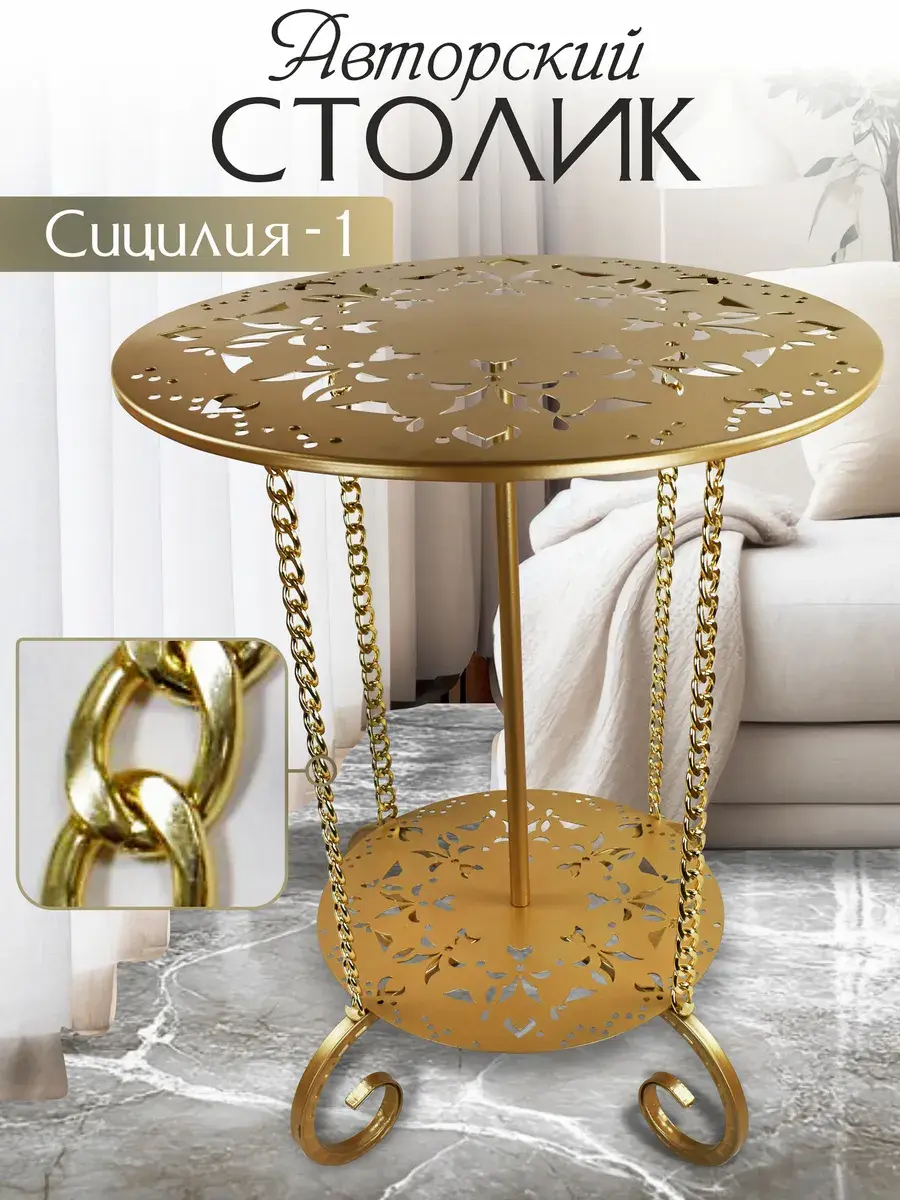 Авторский декоративный столик Сицилия-1 от ЭКОГРУПП – это уникальное сочетание стиля и функциональности, идеально подходящее для создания уютного и стильного интерьера в гостиной, кафе, ресторане или салоне красоты. Столик выполнен из прочных металлических материалов, что обеспечивает его долговечность и надёжность. Его круглая форма и винтажный дизайн добавят вашему пространству уникальный шарм и элегантность. Несмотря на свою компактность, столик обладает достаточным рабочим пространством для журналов, книг или любых других предметов. При его покупке вам потребуется небольшая сборка, что позволяет адаптировать столик под ваши индивидуальные потребности и предпочтения. Сицилия-1 – это не просто мебель, это часть вашего стиля, которая подчеркнёт ваш вкус и умение поддерживать атмосферу в вашем пространстве.