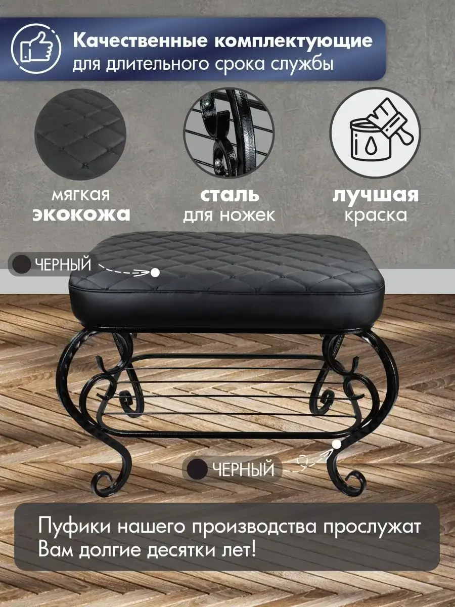 Основные характеристики пуфика включают качественные материалы, такие как экокожа , которая придаёт изделию элегантный вид и приятные тактильные ощущения. Металлические элементы обеспечивают надежность конструкции, а металлические ножки добавляют стилю и стойкости. Размеры пуфика позволяют легко разместить его даже в ограниченном пространстве, что делает его отличным выбором для небольших комнат или балкона.
