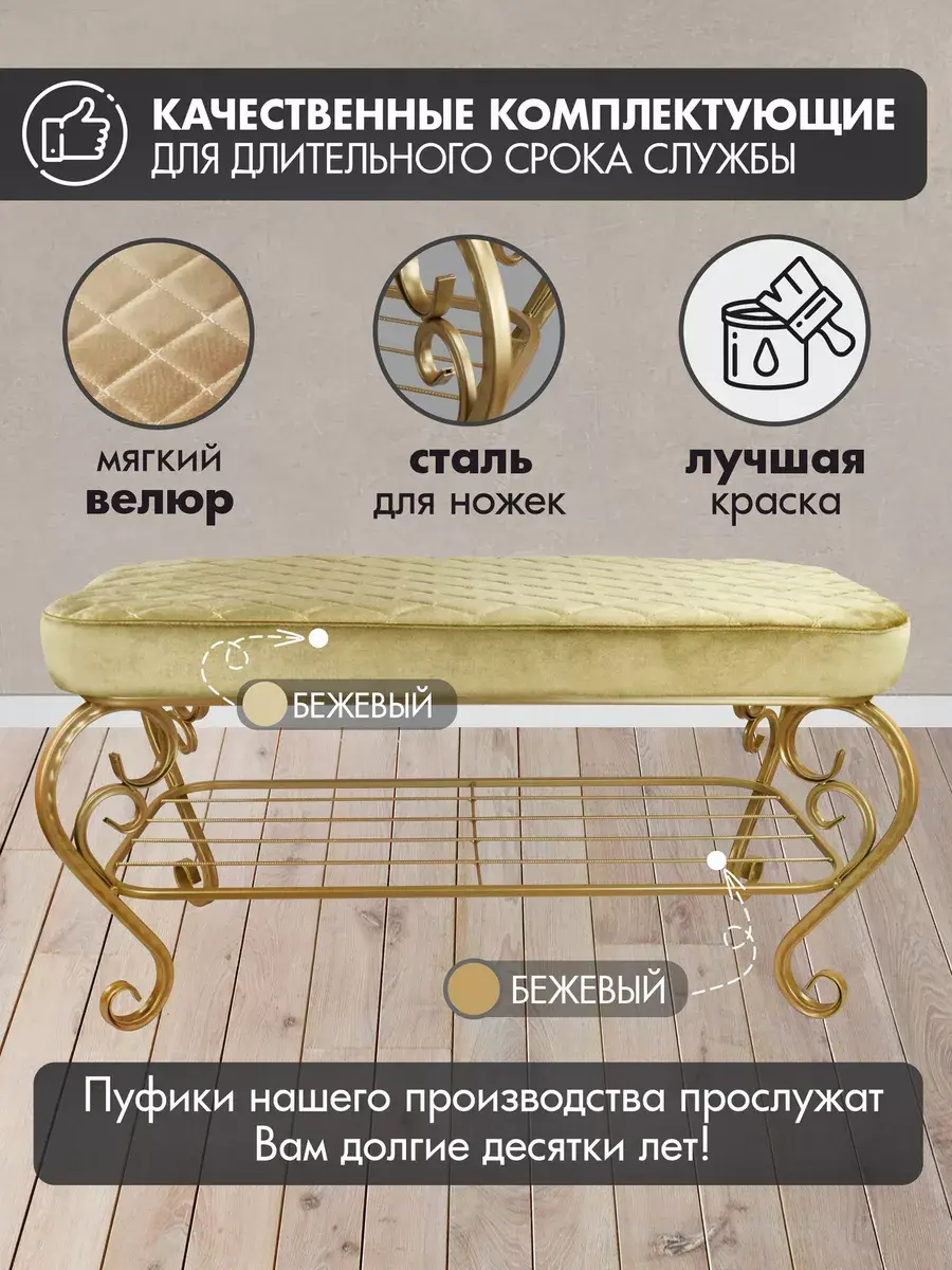 Практичная красота надолго - Пуфик на ножках российского производства имеет прочное стальное основание, продуманную конструкцию и безупречную сборку, поэтому прослужит до 20 лет и будет выглядеть как новый.