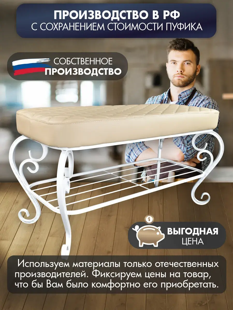 Практичная красота надолго - Пуфик на ножках российского производства имеет прочное стальное основание, продуманную конструкцию и безупречную сборку, поэтому прослужит до 20 лет и будет выглядеть как новый.