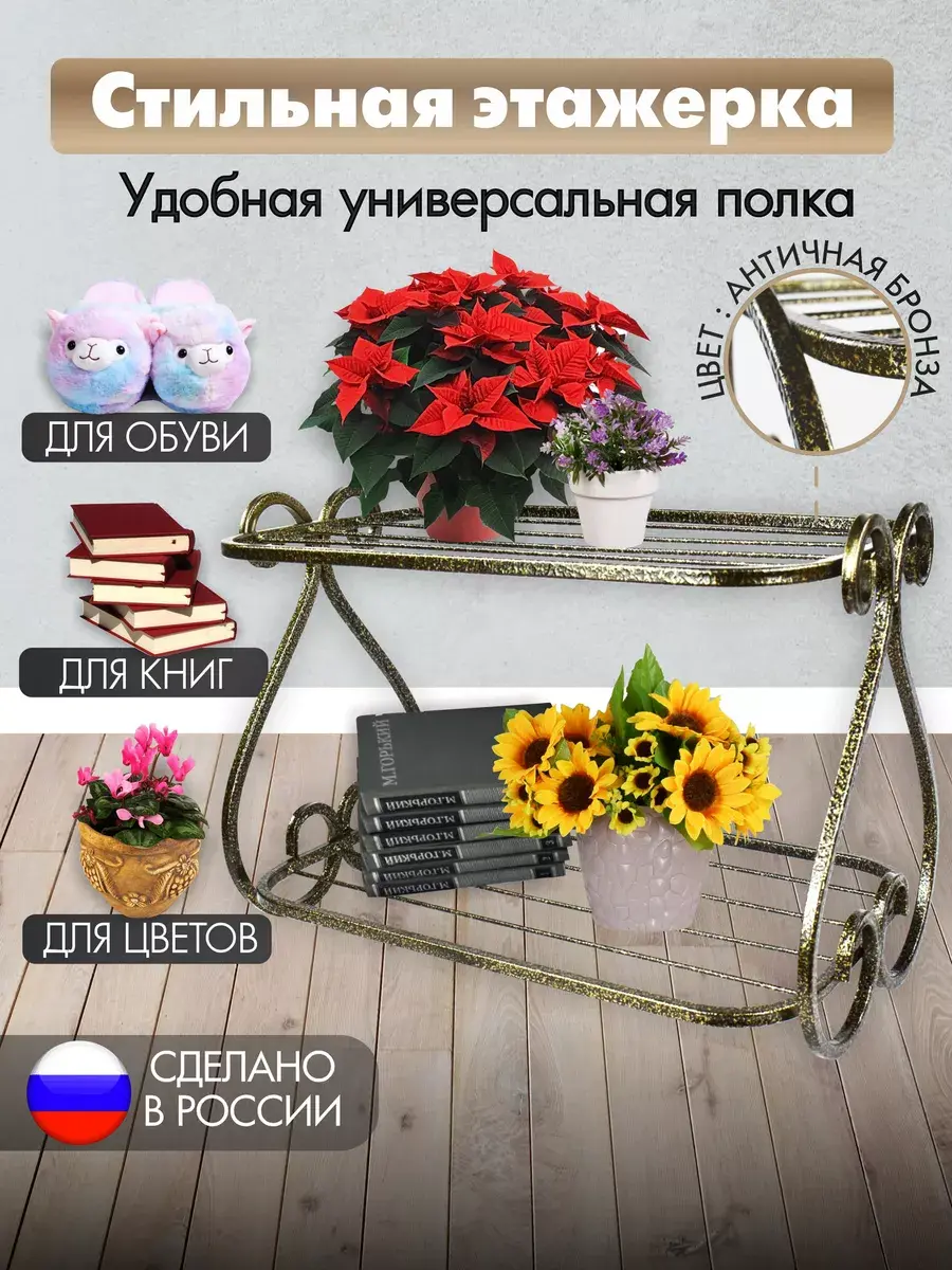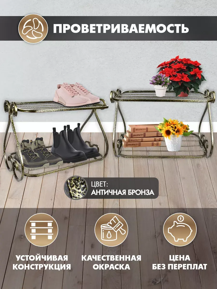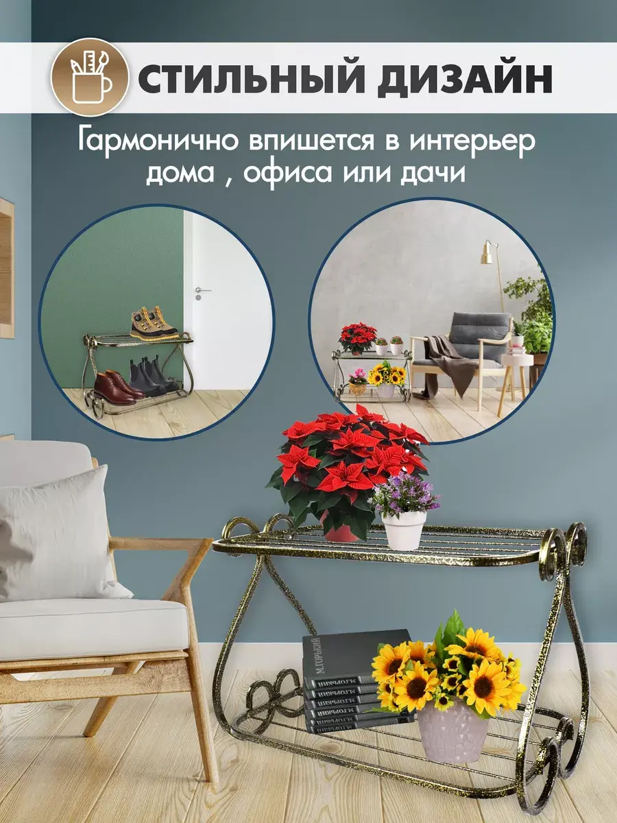 Универсальная этажерка - идеальное решение для организации пространства в вашей прихожей или коридоре. Эта элегантная и стильная мебель изготовлена из прочного металла и окрашена порошковой краской, что придает ей прочность и долговечность.У этажерки есть две полочки, которые позволяют удобно разместить вашу обувь, цветы и книги. Она идеально подходит в качестве обувницы в прихожую или как полка для обуви в коридоре. Благодаря своей компактной конструкции, она не займет много места, но при этом предоставит достаточно места для хранения.Эта металлическая этажерка для обуви обеспечивает удобный доступ к вашей обуви, сохраняя ее в порядке и защищая от пыли. Сборка не требуется, благодаря чему вы сможете быстро насладиться ее преимуществами. Кроме того, она стильно дополнит ваш интерьер, добавив нотку винтажности и элегантности.Вы можете использовать эту универсальную этажерку не только для обуви, но и для различных аксессуаров, таких как сумки, шапки или зонты. Она легко используется, как полезный органайзер, помогая вам поддерживать порядок и чистоту в вашей прихожей или коридоре.Будьте уверены в качестве этой мебели, она изготовлена с использованием высококачественных материалов и протестирована на прочность и надежность. Каждая деталь этой этажерки продумана до мелочей, чтобы обеспечить вам максимальный комфорт и удовлетворение от использования.Выбирайте качественную мебель, которая сделает вашу прихожую или коридор более функциональными и привлекательными. Универсальная этажерка для обуви станет отличным решением для организации вашего пространства и создания уютной атмосферы. Позвольте себе наслаждаться порядком и стильным дизайном с этой прекрасной мебелью.