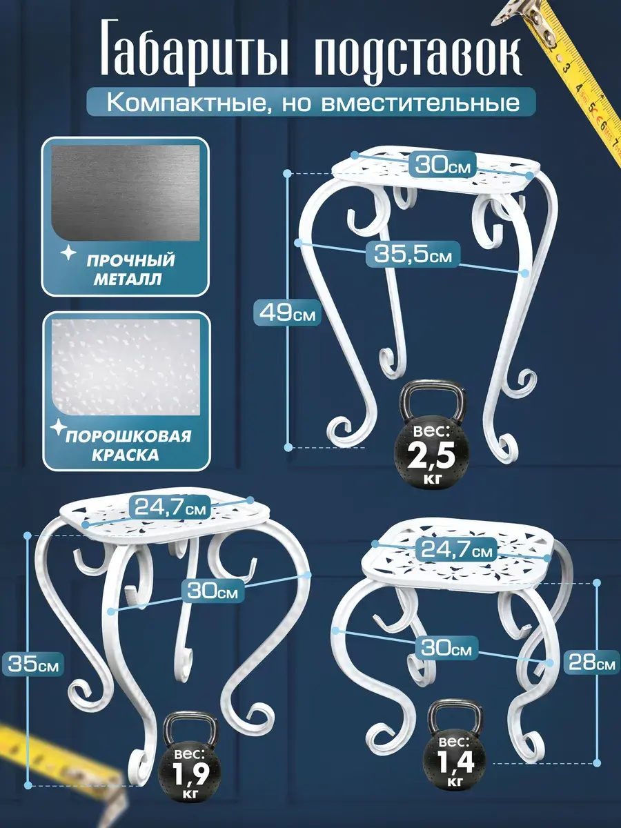 Комплект подставок состоит из 3-х штук. Модели разного размера идеально подойдут для разных помещений. Компактные, но вместительные, они позволят легко расставить вещи даже там, где мало пространства.