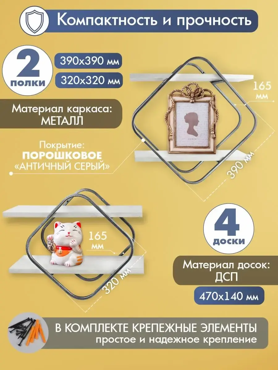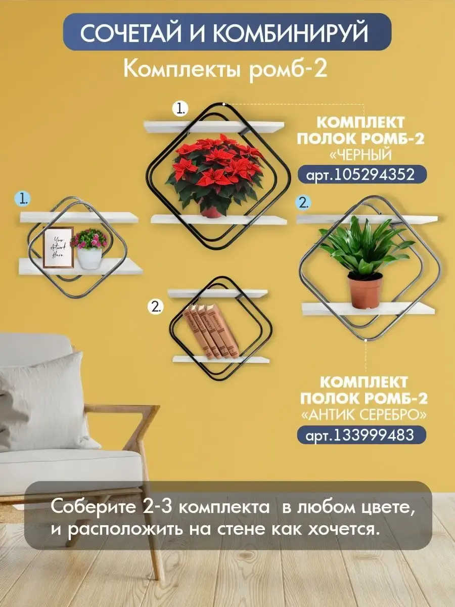 Комплект навесных настенных открытых полок серии РОМБ-2 для книг и цветов в оригинальном дизайнерском стиле. Используйте оригинальный и практичный декор для дома, чтобы придать особый шарм помещению и без труда поддерживать порядок. Выполненные в дизайнерском стиле полочки на стену от компании «ЭКОГРУПП» гармонично впишутся в любой интерьер. ●Будет радовать десятки лет. Настенная полка изготовлена из прочного ДСП, металлические части покрыты порошковой краской, поэтому срок службы неограничен. ●Подойдет для разных целей. Эта мебель для гостиной, прихожей или ванной идеальна для хранения книг, цветов, сувениров и других мелочей.●Смотрится стильно. 2-ярусная полка лофт ромбовидной формы украсит современный и классический интерьер.●Как новенькая спустя годы. Благодаря порошковому покрытию , настенная открытая полка долго сохраняет первозданный вид, не тускнеет и не царапается. ●Экономит место. Компактные размеры 39х39 и 30х30 позволяют использовать эту