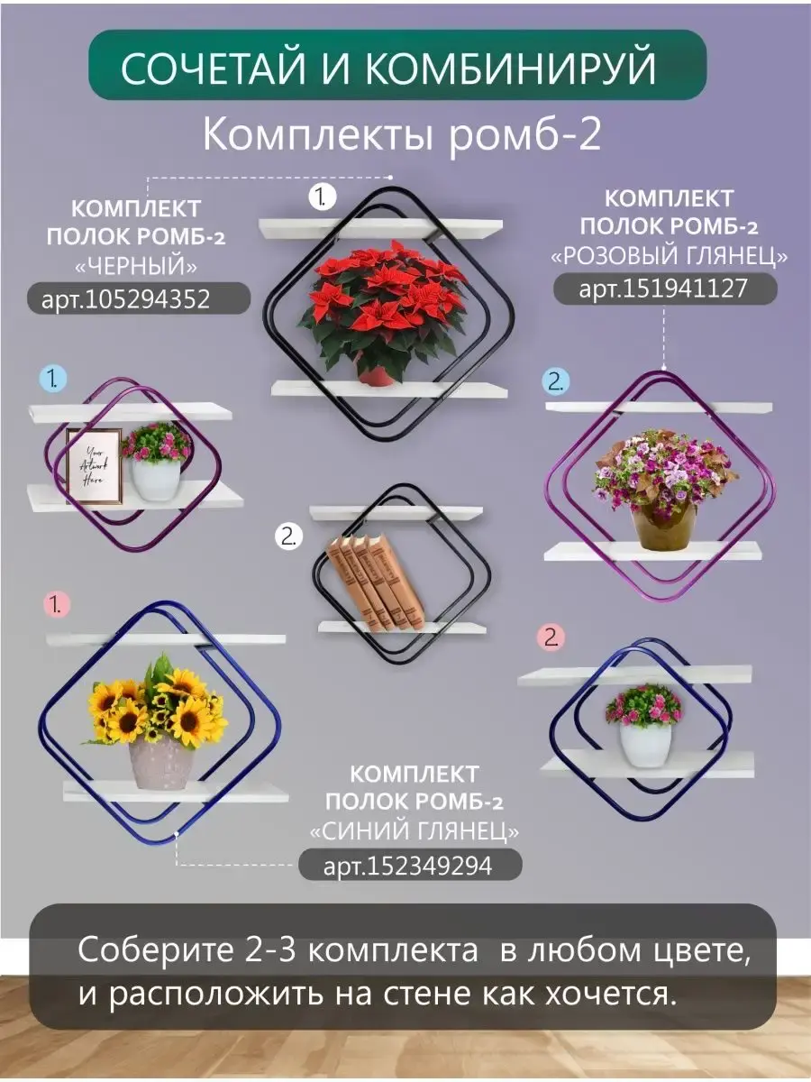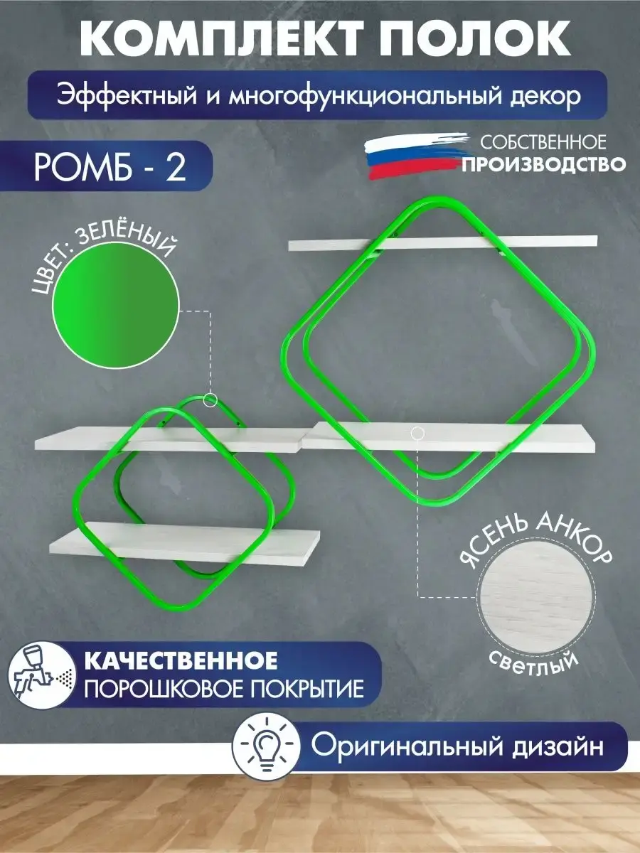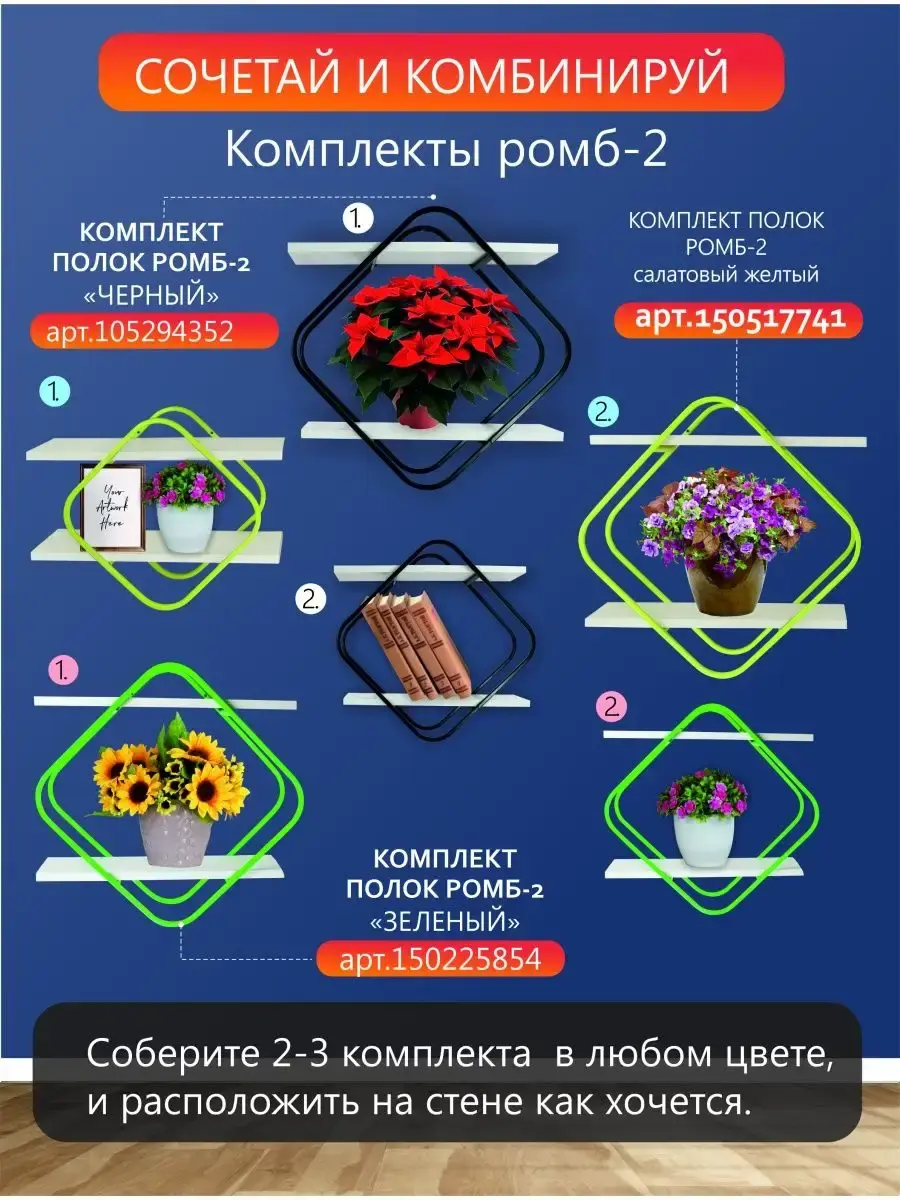 Комплект навесных настенных открытых полок серии РОМБ-2 для книг и цветов в оригинальном дизайнерском стиле. Используйте оригинальный и практичный декор для дома, чтобы придать особый шарм помещению и без труда поддерживать порядок. Выполненные в дизайнерском стиле полочки на стену от компании «ЭКОГРУПП» гармонично впишутся в любой интерьер. ●Будет радовать десятки лет. Настенная полка изготовлена из прочного ДСП, металлические части покрыты порошковой краской, поэтому срок службы неограничен. ●Подойдет для разных целей. Эта мебель для гостиной, прихожей или ванной идеальна для хранения книг, цветов, сувениров и других мелочей.●Смотрится стильно. 2-ярусная полка лофт ромбовидной формы украсит современный и классический интерьер.●Как новенькая спустя годы. Благодаря порошковому покрытию , настенная открытая полка долго сохраняет первозданный вид, не тускнеет и не царапается. ●Экономит место. Компактные размеры 39х39 и 30х30 позволяют использовать эту
