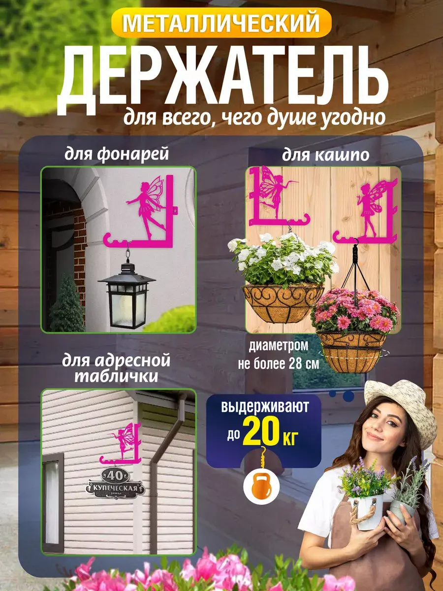 С монтажом держателя для фонаря и цветов справится даже школьник: 3 отверстия под саморезы обеспечивают надежное крепление, а 3 варианта подвеса — свободу выбора.