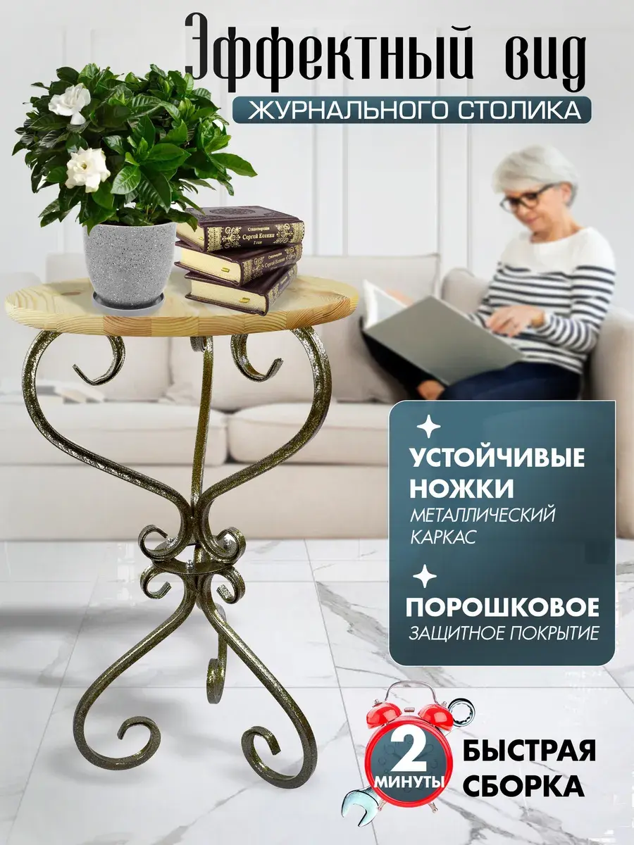 Ножки журнального столика изготовлены из высокопрочного металла. Благодаря их изогнутой форме, конструкция смотрится легко и утонченно. А за счет устойчивых нескользящих оснований выдерживает нагрузку до 50 кг. Порошковое покрытие служит защитой от коррозии, царапин и выцветания. Поэтому металлический столик можно использовать в помещениях, где высокая влажность, перепады температур, попадание прямых солнечных лучей.