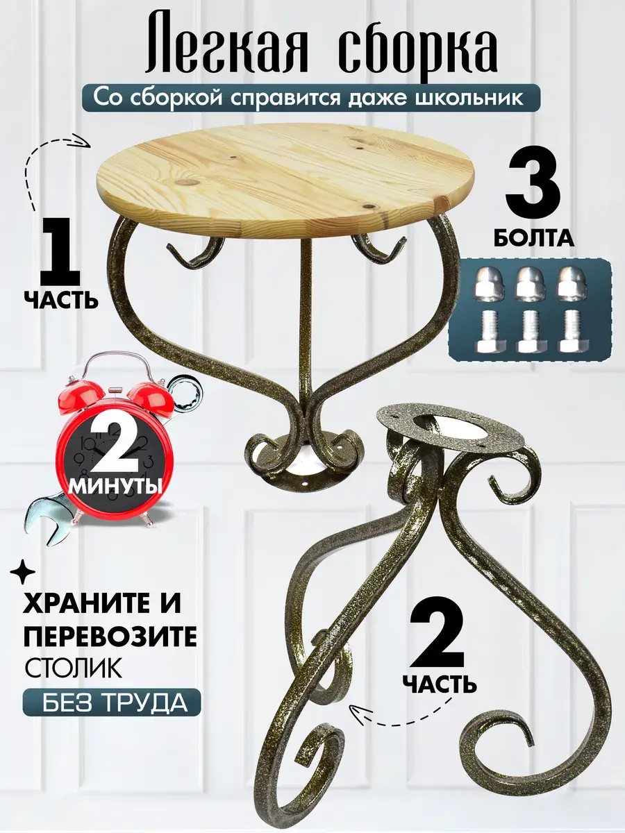 Сборка изделия занимает всего пару минут. Закрутите три болта (прилагаются в комплекте), и разборный столик готов. Когда нужно освободить место или перевезти мебель для дома, также просто и быстро демонтируйте его.