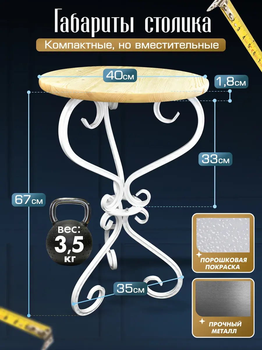 Ножки журнального столика изготовлены из высокопрочного металла. Благодаря их изогнутой форме, конструкция смотрится легко и утонченно. А за счет устойчивых нескользящих оснований выдерживает нагрузку до 50 кг. Порошковое покрытие служит защитой от коррозии, царапин и выцветания. Поэтому металлический столик можно использовать в помещениях, где высокая влажность, перепады температур, попадание прямых солнечных лучей.