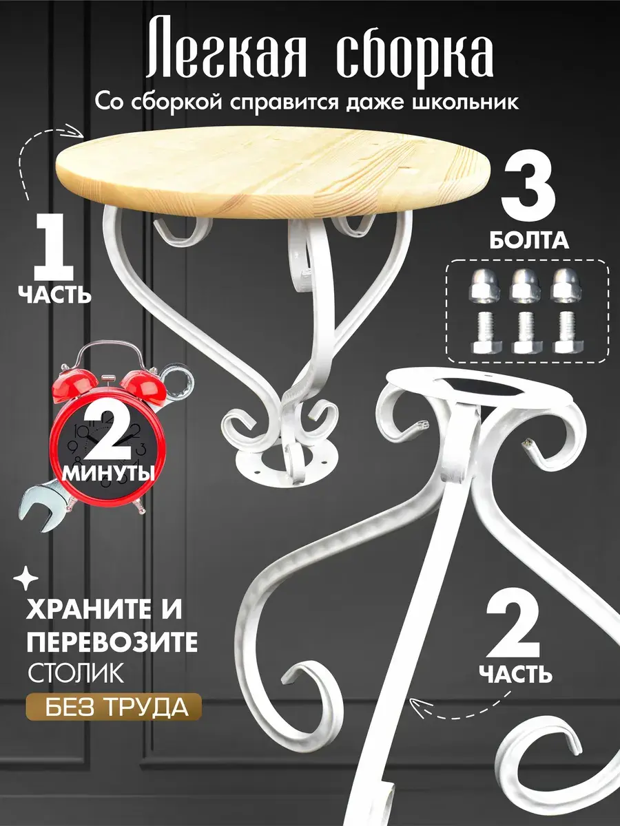 Сборка изделия занимает всего пару минут. Закрутите три болта (прилагаются в комплекте), и разборный столик готов. Когда нужно освободить место или перевезти мебель для дома, также просто и быстро демонтируйте его.