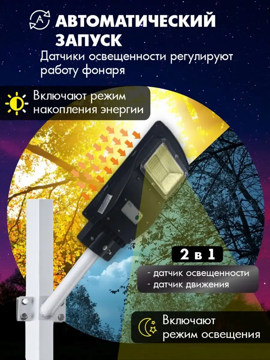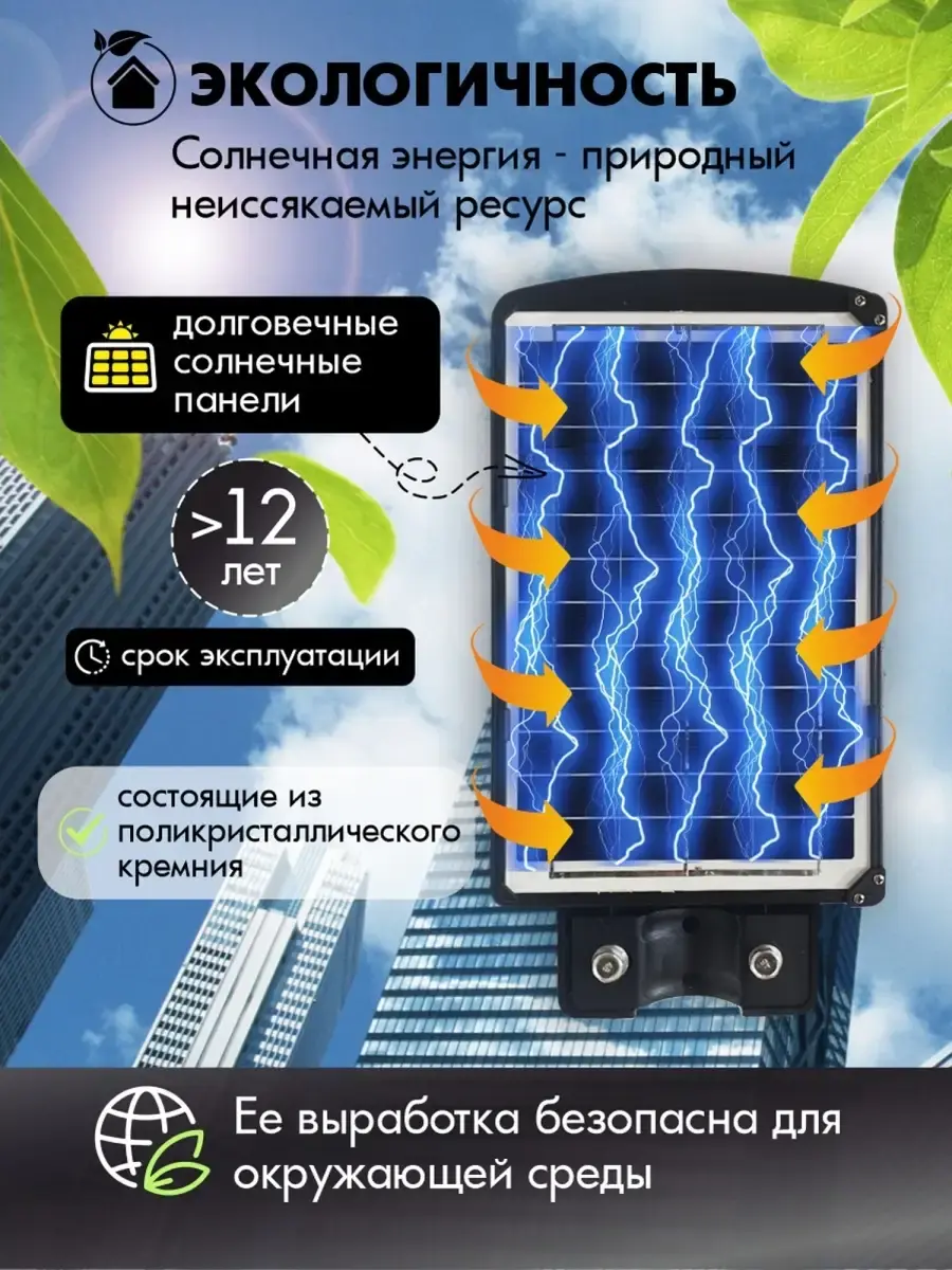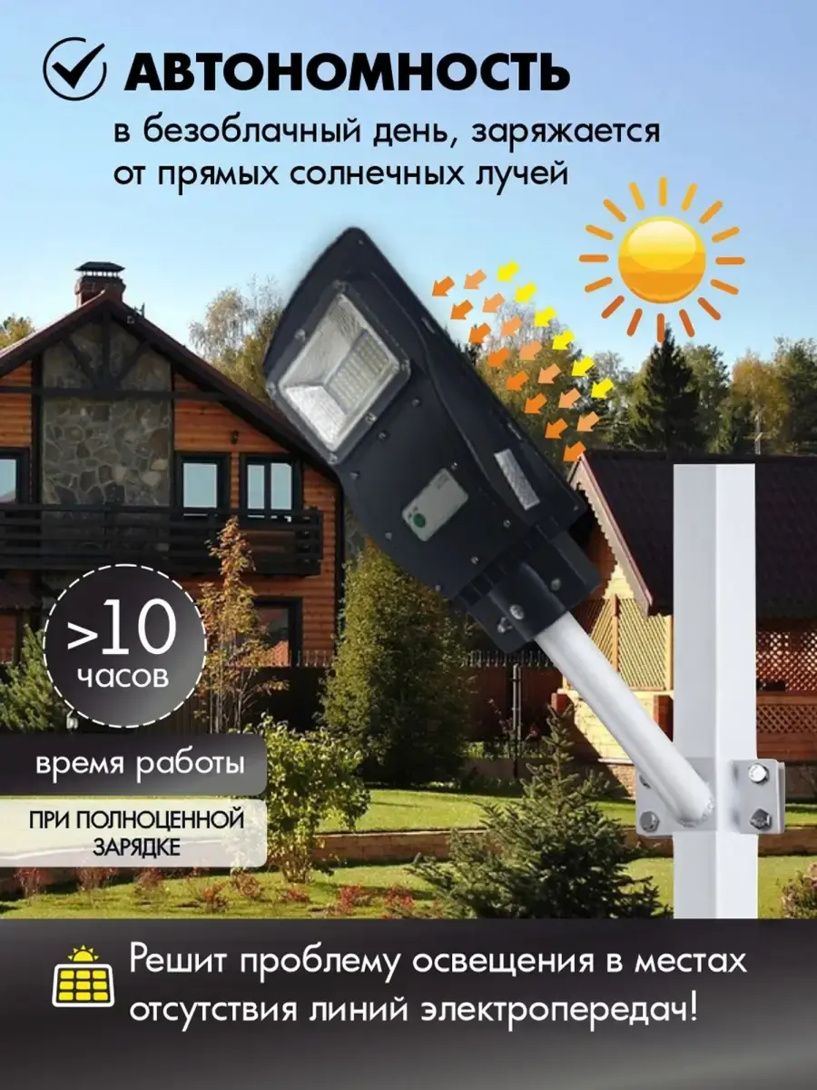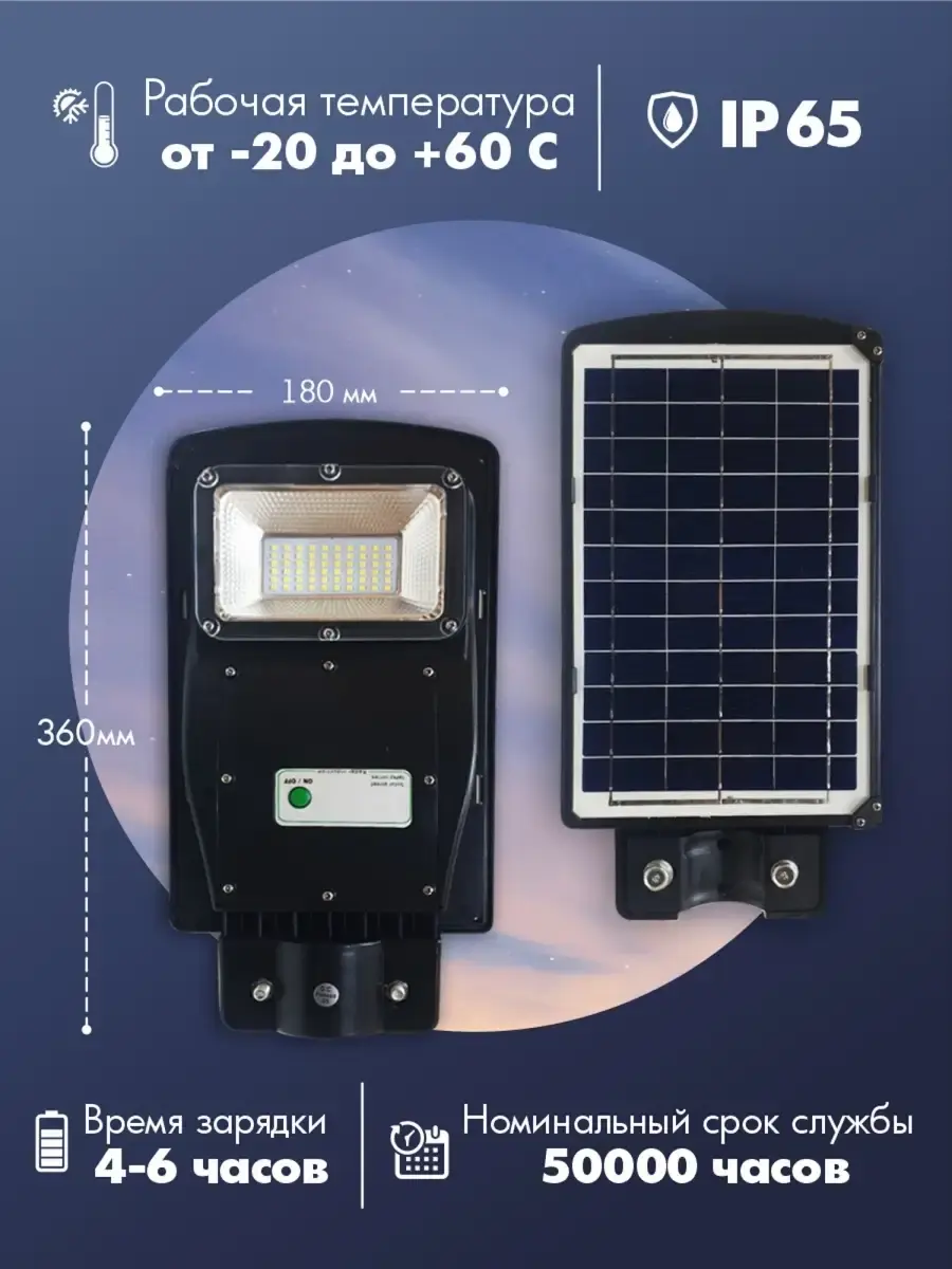 Кронштейн в комплект не входит!! Светодиодный фонарь на солнечной батарее для освещения улицы, шоссе, сада, площади или любого другого места на открытом воздухе- Экологичность. Солнечная энергия - природный неиссякаемый ресурс. Его выработка безопасна для окружающей среды- Финансовая выгода. Нет дополнительных трат на оплату счетов за электроэнергию, прокладку кабеля и монтаж оборудования.- Автоматический запуск. Датчики освещенности регулируют работу фонаря, включая при наступлении сумерек и переводя в режим накопления энергии днем.- Водонепроницаемость. Система адаптирована к работе в российском климате, герметичный корпус защищает от осадков и аномальных температур.- Простая установка. Подключение фонаря без проведения кабеля и близости к линиям электропередач.- Лаконичный внешний вид беспроводной системы освещения дополняет идею дизайна наружного пространства. Мягкий свет фонаря создает комфортные условия для передвижения по улице в темное время суток.Внимание ! Кронштейн в комплект не входит!!