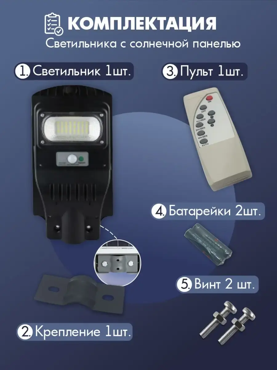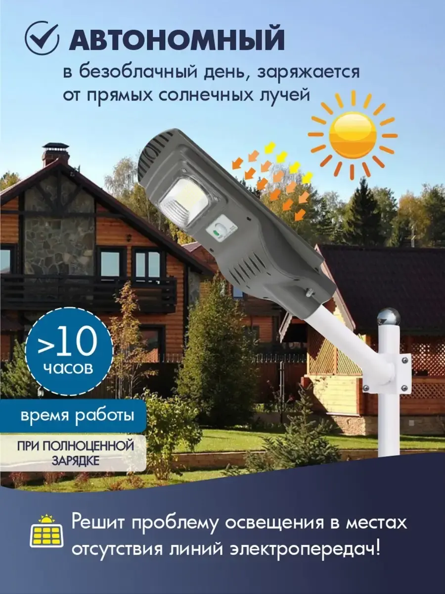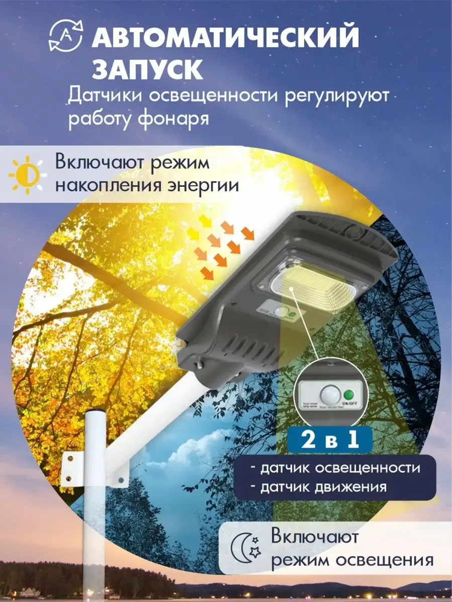 - Перед использованием необходимо зарядить фонарь на солнце, предварительно включить кнопку на нём, зелёный или синий свет на лампочке включения говорит о том , что светильник заряжается. После полной зарядки и установки на кронштейн дальнейшая зарядка не требуется, светильник будет днём заряжаться, а ночью гореть. В нём встроен датчик движения и при приближении человека загорается на 100 процентов, когда человек отходит, яркость работы лампы переходит в режим сохранения и становится 30 процентов от максимальной. Также можно на пульте установить постоянное горение в 100 процентов, но время разрядки сократится. Если возникли вопросы задайте их при покупке.- Светодиодный фонарь на солнечной батарее для освещения улицы, шоссе, сада, площади. Автоматический запуск. Датчики освещенности регулируют работу фонаря, включая при наступлении сумерек, Внимание ! Кронштейн в комплект не входит!!