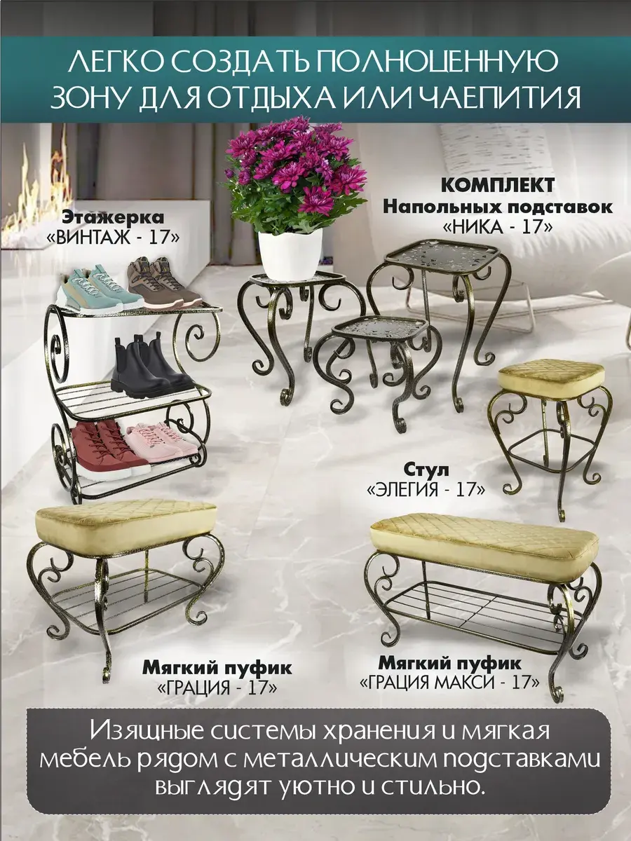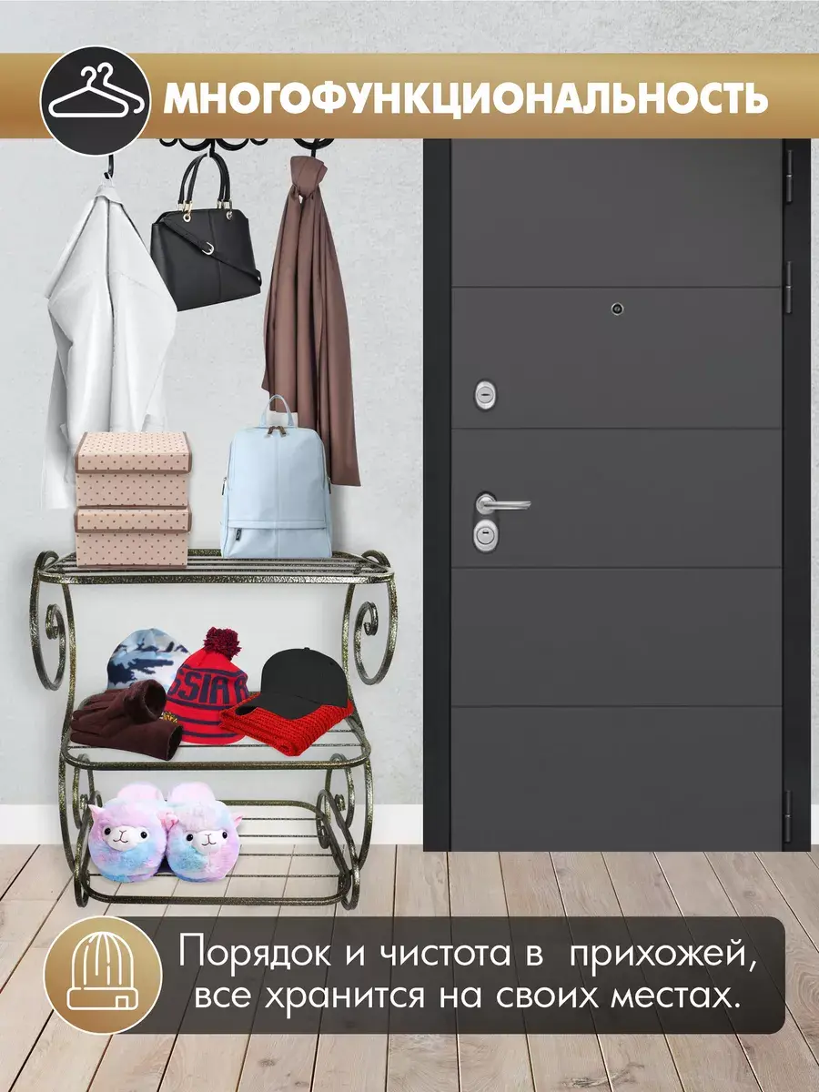 Универсальная этажерка - идеальное решение для организации пространства в вашей прихожей или коридоре. Эта элегантная и стильная мебель изготовлена из прочного металла и окрашена порошковой краской, что придает ей прочность и долговечность.