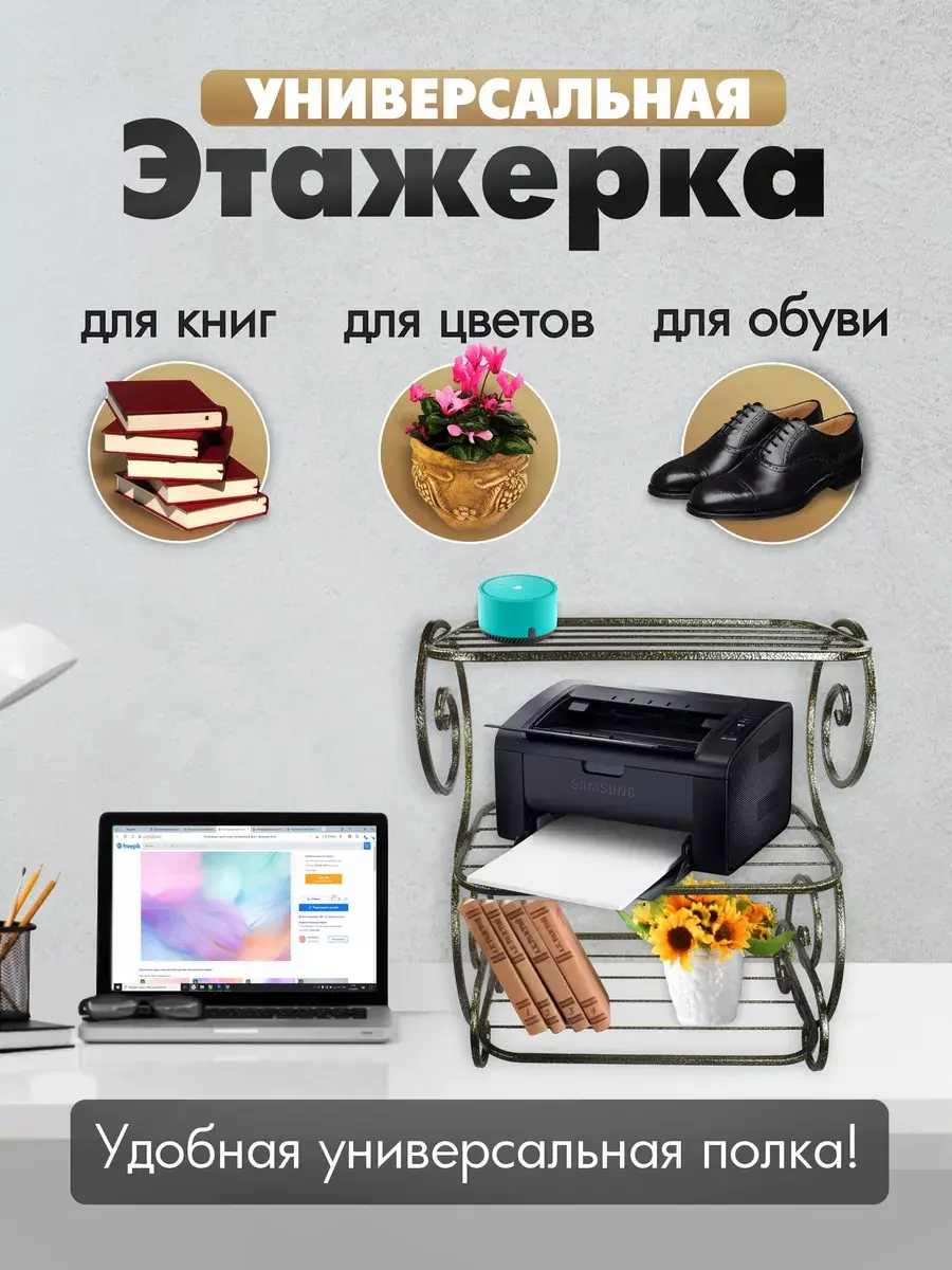 У этажерки есть три полочки, которые позволяют удобно разместить вашу обувь, цветы и книги. Она идеально подходит в качестве обувницы в прихожую или как полка для обуви в коридоре. Благодаря своей компактной конструкции, она не займет много места, но при этом предоставит достаточно места для хранения.
