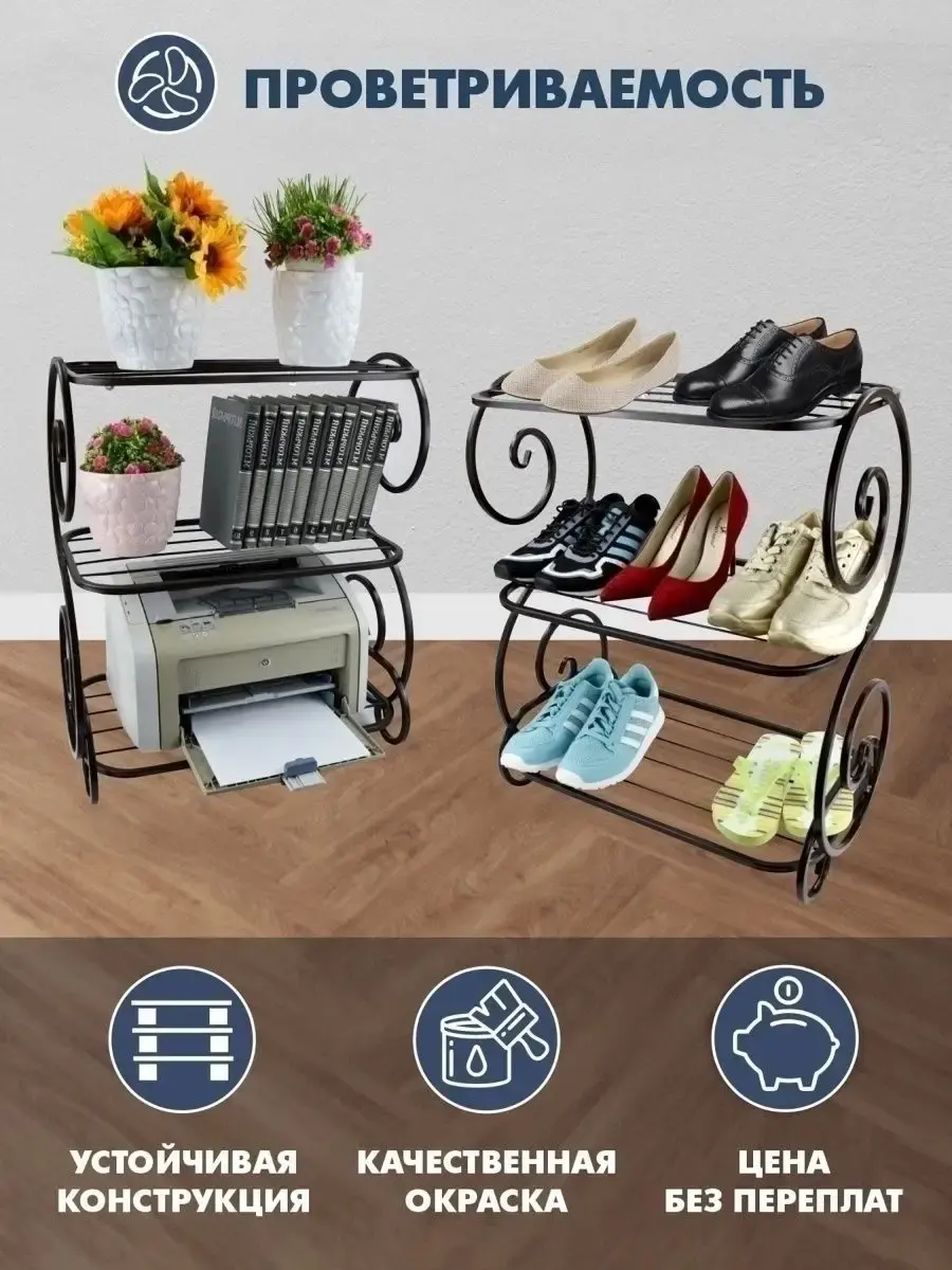 У этажерки есть три полочки, которые позволяют удобно разместить вашу обувь, цветы и книги. Она идеально подходит в качестве обувницы в прихожую или как полка для обуви в коридоре. Благодаря своей компактной конструкции, она не займет много места, но при этом предоставит достаточно места для хранения.