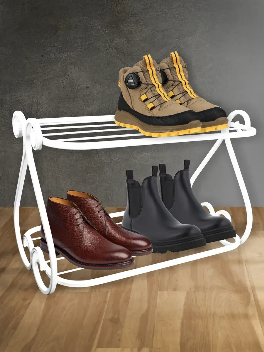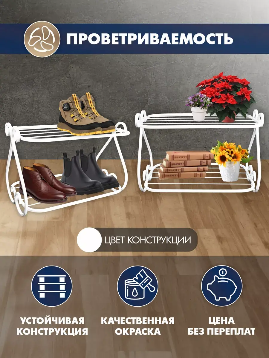 Универсальная этажерка - идеальное решение для организации пространства в вашей прихожей или коридоре. Эта элегантная и стильная мебель изготовлена из прочного металла и окрашена порошковой краской, что придает ей прочность и долговечность.У этажерки есть две полочки, которые позволяют удобно разместить вашу обувь, цветы и книги. Она идеально подходит в качестве обувницы в прихожую или как полка для обуви в коридоре. Благодаря своей компактной конструкции, она не займет много места, но при этом предоставит достаточно места для хранения.Эта металлическая этажерка для обуви обеспечивает удобный доступ к вашей обуви, сохраняя ее в порядке и защищая от пыли. Сборка не требуется, благодаря чему вы сможете быстро насладиться ее преимуществами. Кроме того, она стильно дополнит ваш интерьер, добавив нотку винтажности и элегантности.Вы можете использовать эту универсальную этажерку не только для обуви, но и для различных аксессуаров, таких как сумки, шапки или зонты. Она легко используется, как полезный органайзер, помогая вам поддерживать порядок и чистоту в вашей прихожей или коридоре.Будьте уверены в качестве этой мебели, она изготовлена с использованием высококачественных материалов и протестирована на прочность и надежность. Каждая деталь этой этажерки продумана до мелочей, чтобы обеспечить вам максимальный комфорт и удовлетворение от использования.Выбирайте качественную мебель, которая сделает вашу прихожую или коридор более функциональными и привлекательными. Универсальная этажерка для обуви станет отличным решением для организации вашего пространства и создания уютной атмосферы. Позвольте себе наслаждаться порядком и стильным дизайном с этой прекрасной мебелью.