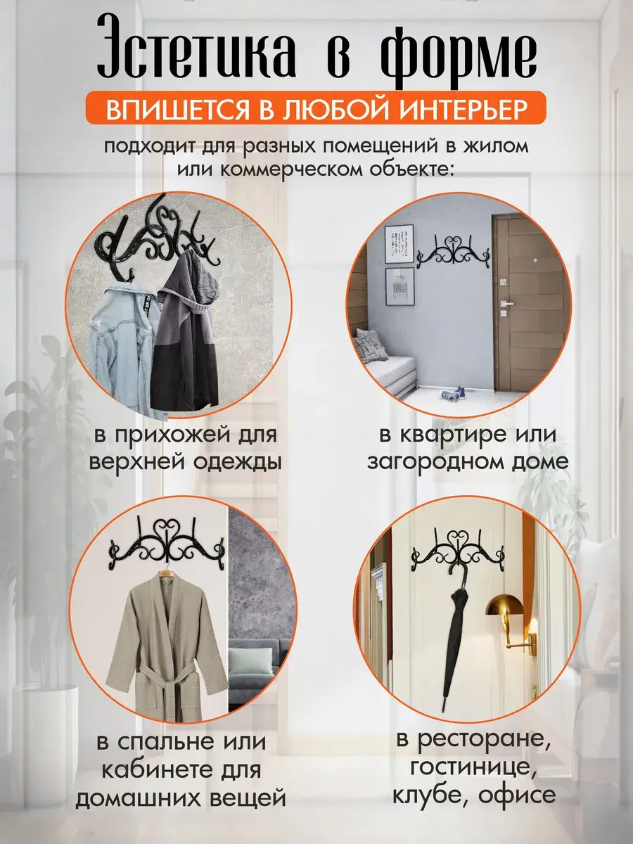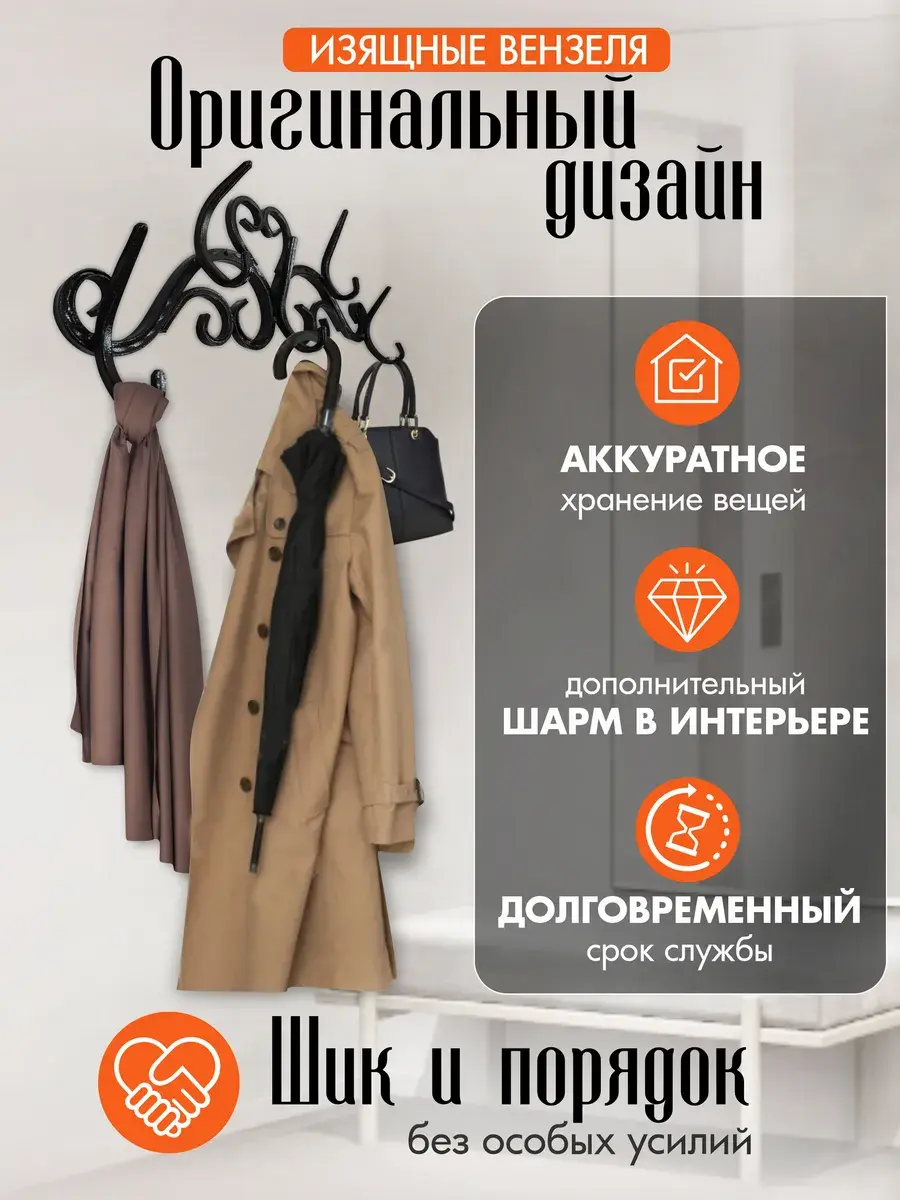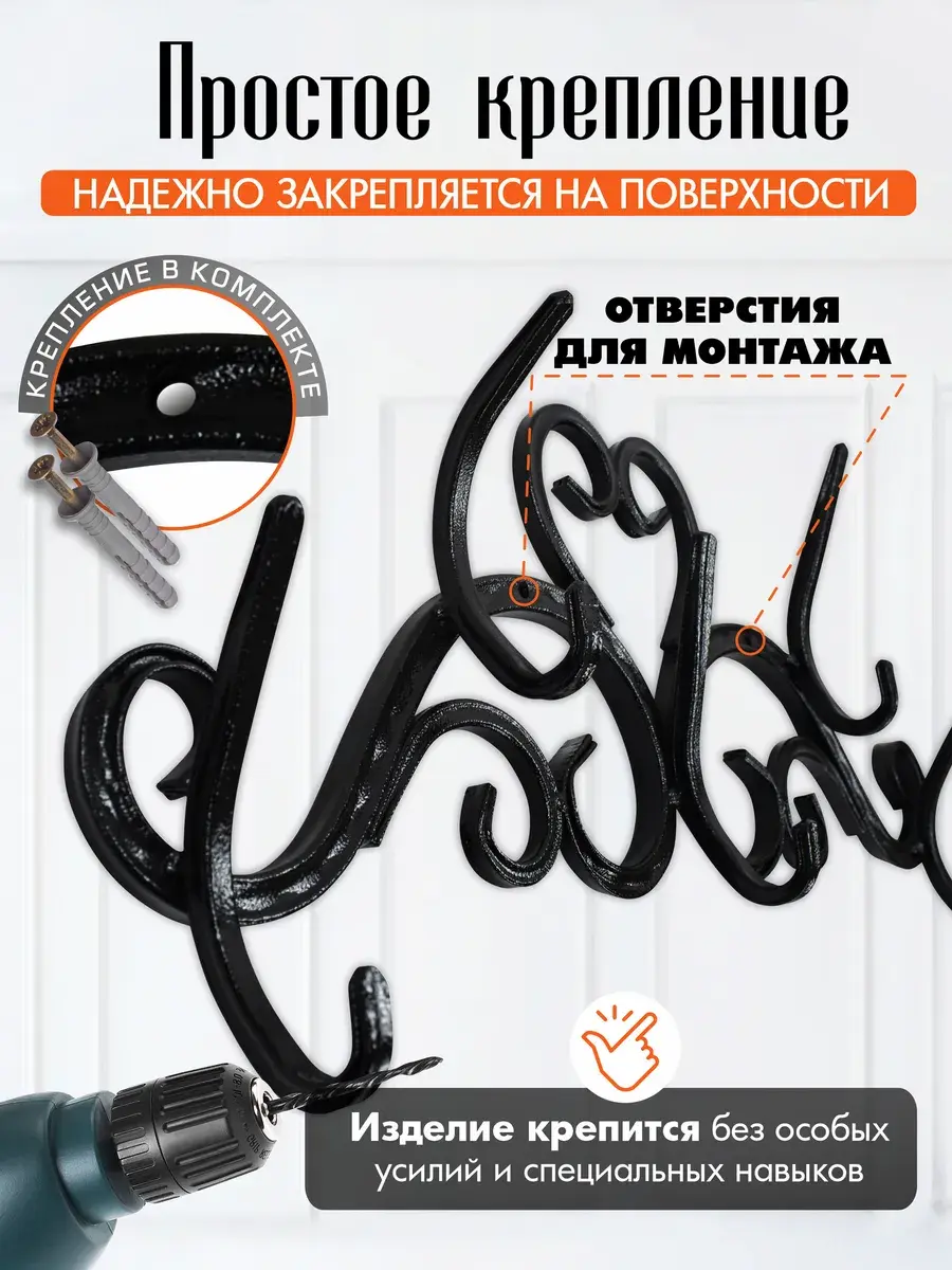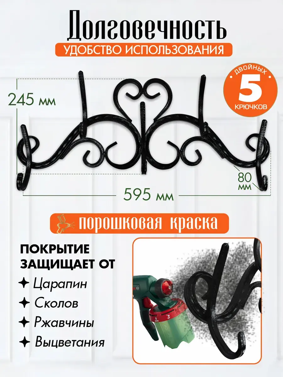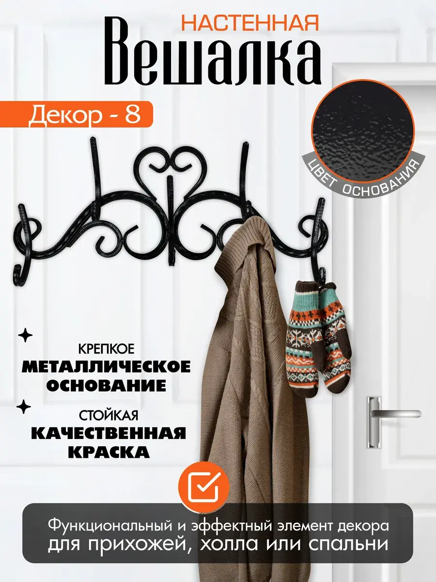 Стильная и надежная вешалка в прихожую, холл или спальню. Создать яркую, комфортную обстановку и поддерживать порядок поможет оригинальная настенная вешалка. Изделие оснащено 5 парными крючками, обеспечивает:- **Долговечность.** Благодаря крепкому металлическому каркасу и надежным красителям атрибут прослужит десятки лет, сохраняя привлекательный вид.- **Простой монтаж.** За счет небольшого веса и специальных отверстий металлическая вешалка для одежды легко и быстро крепится к стене.- **Универсальность.** Функциональная и эффектная модель уместно смотрится в прихожей или гардеробной, столовой или холле, спальне или кабинете.- **Выразительный дизайн.** Вешалка из металла гармонично впишется в классические интерьеры, лофт, прованс и подчеркнет общий стиль.- **Удобство использования.** Крючки стандартной формы расположены по бокам и по центру, позволяют легко дотянуться и разместить вещи аккуратно и надежно. Металлическая вешалка для одежды оригинальной конструкции декора